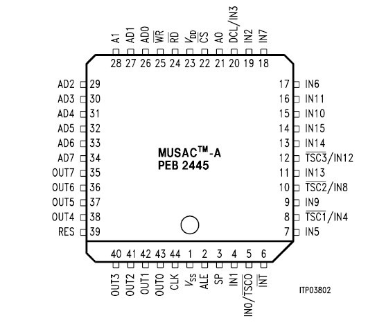 The MUSAC-A (Multipoint Switching and Conferencing Unit) PEB2445NV1.2 is an upward compatible device to the MTSC and MUSAC. It offers in addition the attenuation and amplification of every time slot.